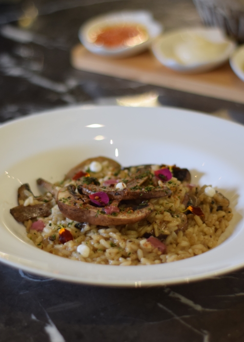 Arroz arbóreo cocido lentamente en caldo clarificado de setas, queso parmesano acompañado con portobellos asados y perejil.