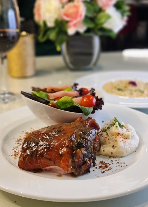 Jamoncito de pollo tierno y jugoso con la piel dorada y crujiente, asado al horno, acompañado con pure de espárragos y salsa verde de aceitunas y capuchinas, servido con espuma de AOVE. -