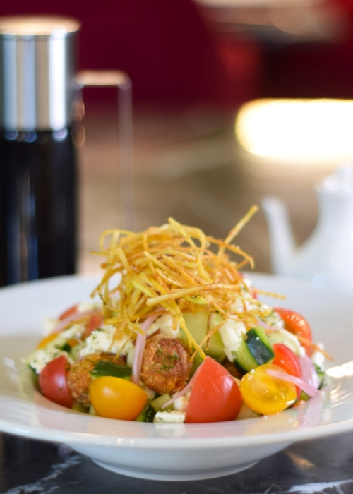 Queso feta ahumado con madera de almendro acompañado con aceitunas negras rellenas de queso mozzarella en textura, tomates frescos, cebolla roja, pepino europeo y AOVE infusionado con orégano y vinagre de vino tinto. -