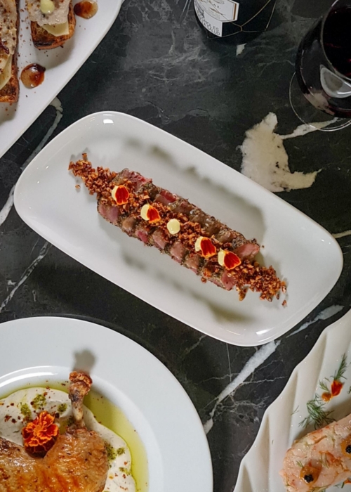 Lomo de atún cubierto con especias mediterráneas, cuidosamente sellado a la parrilla, acompañado con granella crujiente de frutos secos, alioli de aguacate y salsa cítrica de lima, toronja y agua de azahar. -