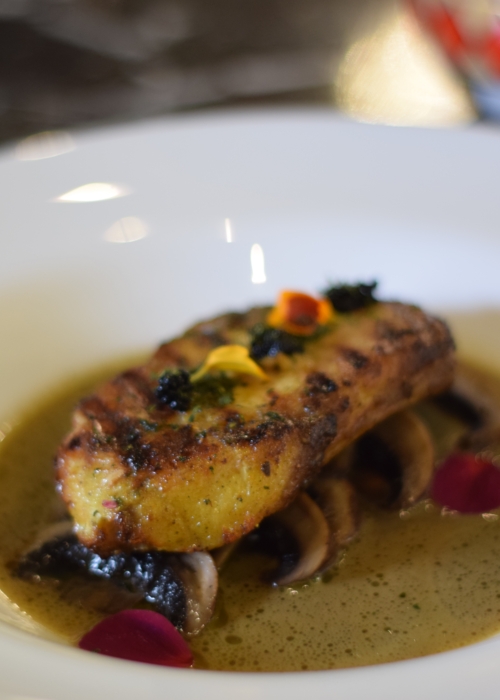 Filete de pesca del día asado a la perfección sobre caldo clarificado de setas, hongo portobello asados, marinado en hierbas italianas, acompañado con caviar negro de lumpfish. -