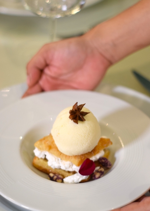 Pasta de hojaldre rellenas de peras confitadas en almíbar de ouzo, rellena con espuma de crema pastelera, acompañado con quenelle de helado de pétalos de rosas o helado de limoncello.BAKLAVA BLUE$31